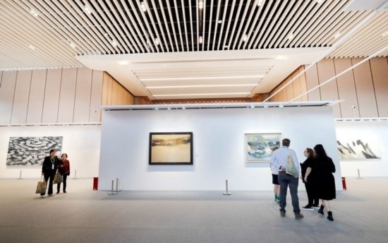 11月9日,觀眾在第七屆進博會國際現(xiàn)當代藝術專區(qū)觀看繪畫藝術展品。新華社記者 方喆 攝