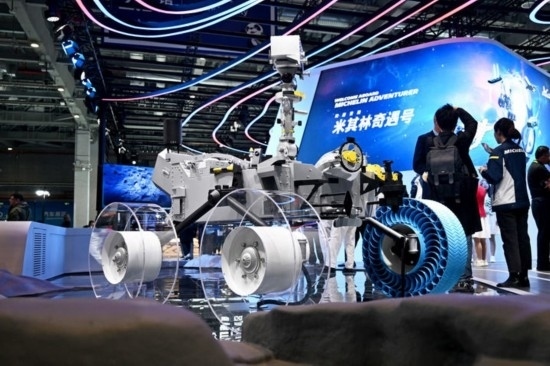 這是11月6日在第七屆進博會汽車展區(qū)拍攝的在亞洲首次亮相的米其林月球探測車輪胎。新華社發(fā)(陳浩明 攝)