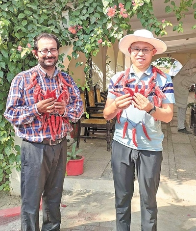 參與中國—巴基斯坦辣椒種植合作項目的中國專家與當(dāng)?shù)丶夹g(shù)員共同慶祝辣椒豐收。本報巴基斯坦分社 瓦卡斯·阿赫邁德攝