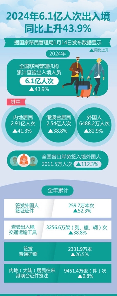 在2024年中國國際傳播年度熱詞榜上,“中國游”一詞名列前十。中國全面放寬優(yōu)化免簽政策,推出一系列便利外國人來華政策舉措,“中國游”成為越來越多外國游客的優(yōu)先選擇。中國國家移民管理局最新數(shù)據(jù)顯示,2024年,全國移民管理機構(gòu)累計查驗出入境人員6.1億人次,同比上升43.9%;其中內(nèi)地居民2.91億人次、港澳臺居民2.54億人次、外國人6488.2萬人次,同比分別上升41.3%、38.8%、82.9%。全國各口岸免簽入境外國人2011.5萬人次,同比上升112.3%。說走就走的“中國游”打開了世界了解中國的新窗口、新通道,向全球展現(xiàn)真實、多元和活力滿滿的中國形象。