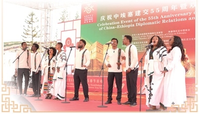 在近日舉辦的“慶祝中埃塞建交55周年暨歡樂春節(jié)活動”上,當(dāng)?shù)孛癖姾铣H肀葋唫鹘y(tǒng)歌曲。