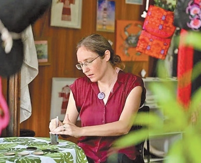 謝敏來自美國芝加哥,曾是一名英語老師的她,如今稱自己為設(shè)計(jì)師、小店店主。謝敏的小店叫“海島樂趣”,位于海南??诎咨抽T公園內(nèi)。“這是五指山市的黎錦手提包,這是保亭村子里的織品,那幾件是東方市的?!钡昀飻[放的黎錦作品出自海南各地村民之手,謝敏如數(shù)家珍。店中還有不少她親手設(shè)計(jì)和制作的文創(chuàng)產(chǎn)品,靈感都來自魚、烏龜、閃電等傳統(tǒng)黎錦紋樣。