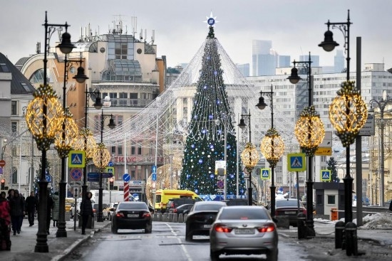2023年12月22日,在俄羅斯首都莫斯科,車輛從新年樅樹附近駛過(guò)。新華社發(fā)(亞歷山大攝)