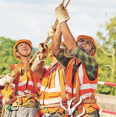 東海岸鐵路項目工人在進行中T梁架設(shè)。
