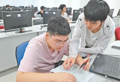廈門大學馬來西亞分校能源與化工學院工程制圖課上,兩名學生在討論作業(yè)。