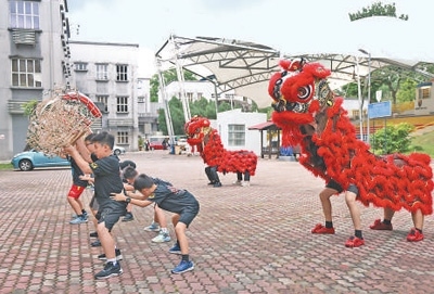 馬來西亞中小學生在馬來亞大學醒獅團組織的培訓課上練習舞獅。