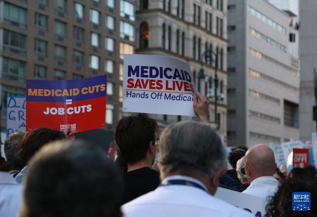 5月1日,人們手持標(biāo)語(yǔ)在美國(guó)紐約參加抗議特朗普政府政策的集會(huì)和游行。新華社發(fā)(郭克攝)