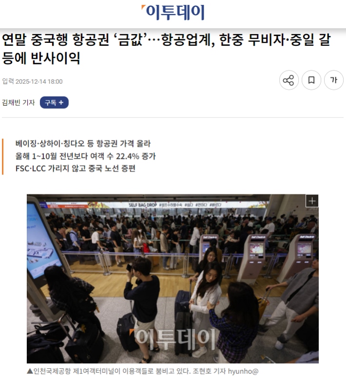 市場(chǎng)旺盛的需求直接傳導(dǎo)至價(jià)格層面。韓國(guó)《Etoday》近日一篇題為《年底飛往中國(guó)的航班“如同黃金般珍貴”》的報(bào)道,生動(dòng)描繪了當(dāng)前中韓航線的熱度。報(bào)道指出,截至12月中旬,韓國(guó)飛往北京、上海、青島等主要中國(guó)城市的機(jī)票價(jià)格大幅上漲。例如,大韓航空?qǐng)?zhí)飛的首爾-上海往返票價(jià)已漲至約40萬韓元,濟(jì)州航空的韓元-青島航線往返票價(jià)也接近30萬韓元。業(yè)內(nèi)分析指出,即便考慮季節(jié)性因素,當(dāng)前票價(jià)仍比去年同期高出約20%。來往中韓“一票難求”,華燈初上的明洞和外灘,熱氣騰騰的烤肉與火鍋,游客們的熱情互動(dòng)給這個(gè)寒冷的冬天帶來暖意。