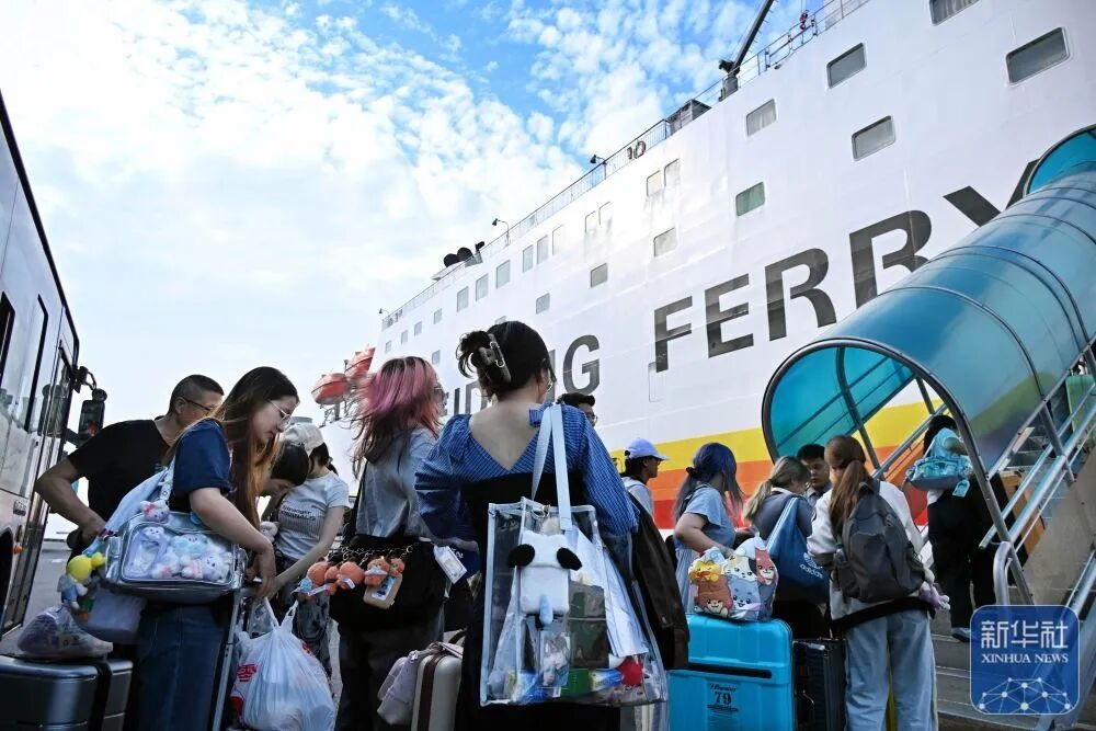 國(guó)慶假期,在青島郵輪母港碼頭,旅客登上往返青島港與仁川港的客貨班輪“新金橋5號(hào)”。新華社記者 李紫恒 攝