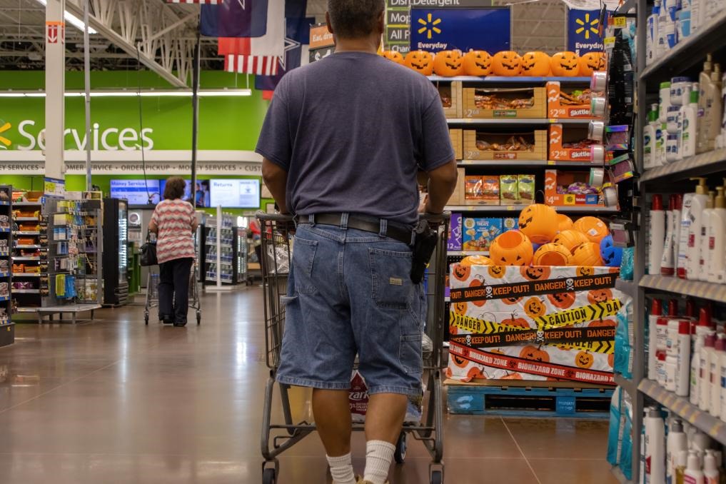 2022年8月31日,在美國(guó)得克薩斯州普萊諾市,一名男子隨身攜帶槍支逛超市。新華社發(fā)(金新攝)