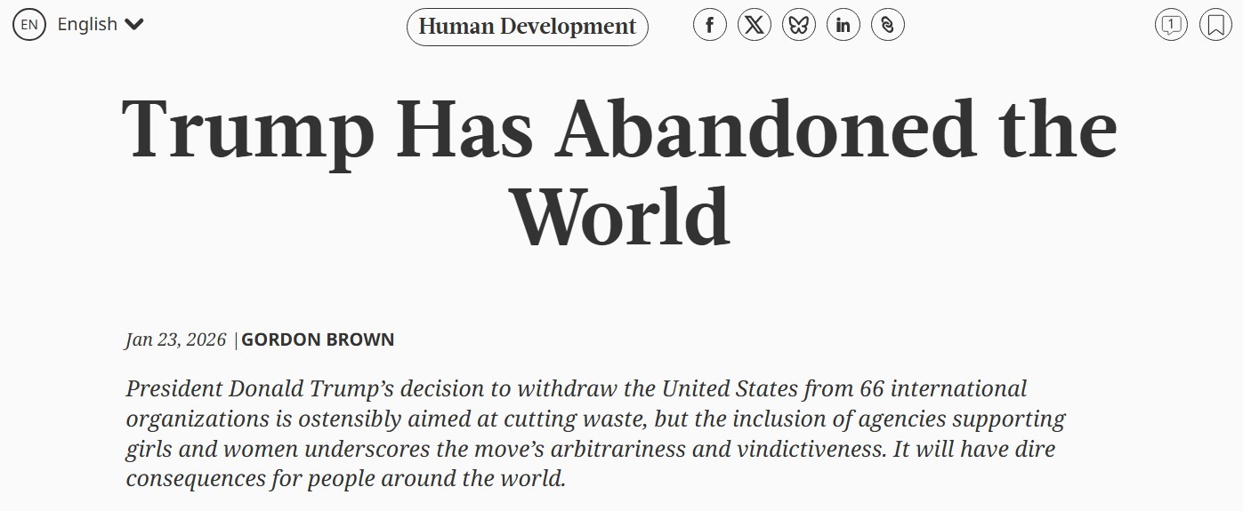 當(dāng)?shù)貢r(shí)間1月27日,美國退出旨在應(yīng)對氣候變化的《巴黎協(xié)定》正式生效。這已經(jīng)是美國政府第二次退出該協(xié)定。而在本月初,美國宣布退出66個(gè)國際組織。對此,世界報(bào)業(yè)辛提加網(wǎng)站日前刊登英國前首相、世界衛(wèi)生組織全球衛(wèi)生籌資大使戈登·布朗的署名文章,批評美國政府此舉不僅凸顯其決策的隨意性與報(bào)復(fù)性,也將給全球民眾帶來災(zāi)難性后果。