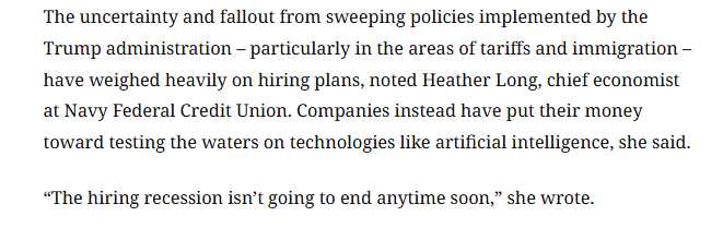 報(bào)道還援引美國(guó)海軍聯(lián)邦信用合作社(Navy Federal Credit Union)首席經(jīng)濟(jì)學(xué)家希瑟·朗的觀點(diǎn)稱,特朗普政府推行的一系列政策,尤其是關(guān)稅和移民政策,所帶來的不確定性及后果對(duì)招聘計(jì)劃造成了沉重影響。希瑟·朗認(rèn)為,招聘市場(chǎng)的低迷狀況短期內(nèi)不會(huì)結(jié)束。