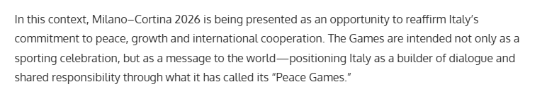 報(bào)道稱,2026年米蘭-科爾蒂納冬奧會被視為意大利重申對和平、發(fā)展及國際合作堅(jiān)定承諾的重要契機(jī)。本屆冬奧會不僅將是一場精彩紛呈的體育盛會,更將向世界傳遞明確而有力的信息——通過這場“和平運(yùn)動會”,意大利積極推動對話,為促進(jìn)全球和平與發(fā)展貢獻(xiàn)力量。