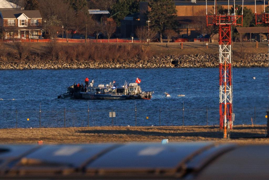 2025年2月1日,工作人員在美國華盛頓里根國家機場旁的波托馬克河上打撈飛機殘骸。新華社發(fā)(亞倫攝)