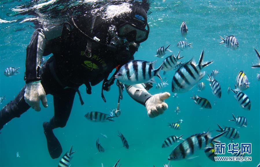 在海南三亞蜈支洲島海域,旅游區(qū)工作人員即將下潛到海洋牧場進(jìn)行作業(yè)(4月27日攝)。新華社記者楊冠宇攝