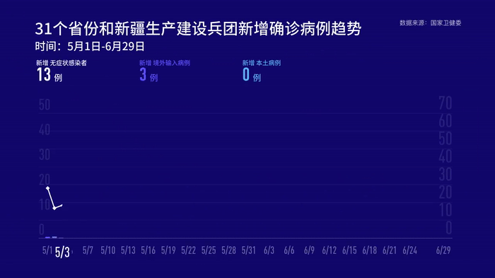 6月29日0—24時,31個省(自治區(qū)、直轄市)和新疆生產(chǎn)建設(shè)兵團(tuán)報告新增確診病例19例,其中境外輸入病例11例(廣東4例,上海3例,四川3例,甘肅1例),本土病例8例(北京7例,上海1例);無新增死亡病例;新增疑似病例1例,為境外輸入病例(在上海)。