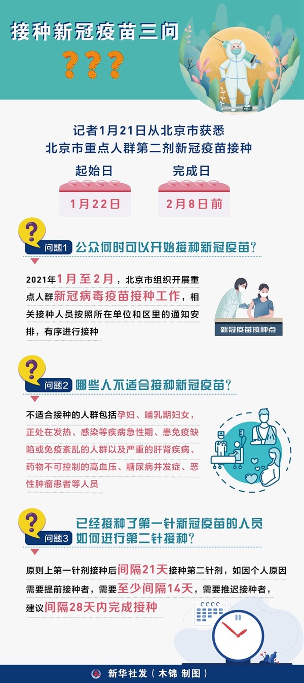 新華社北京1月21日電(記者俠克)記者21日從北京市獲悉,北京市重點人群第二劑新冠疫苗接種起始日為1月22日,計劃在2月8日前完成。截至2021年1月19日,北京市已完成重點人群第一劑疫苗接種,累計接種人數(shù)超過190萬。