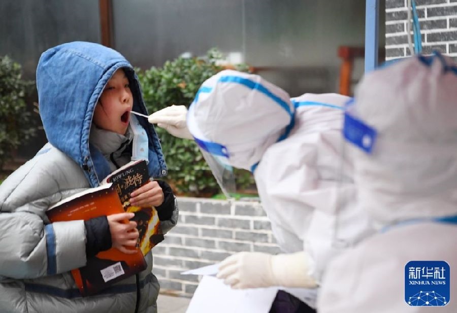 1月10日,在鄭州市二七區(qū)政通路一處核酸檢測(cè)點(diǎn),醫(yī)務(wù)人員為小朋友進(jìn)行核酸檢測(cè)取樣。新華社發(fā)(丁友明攝)