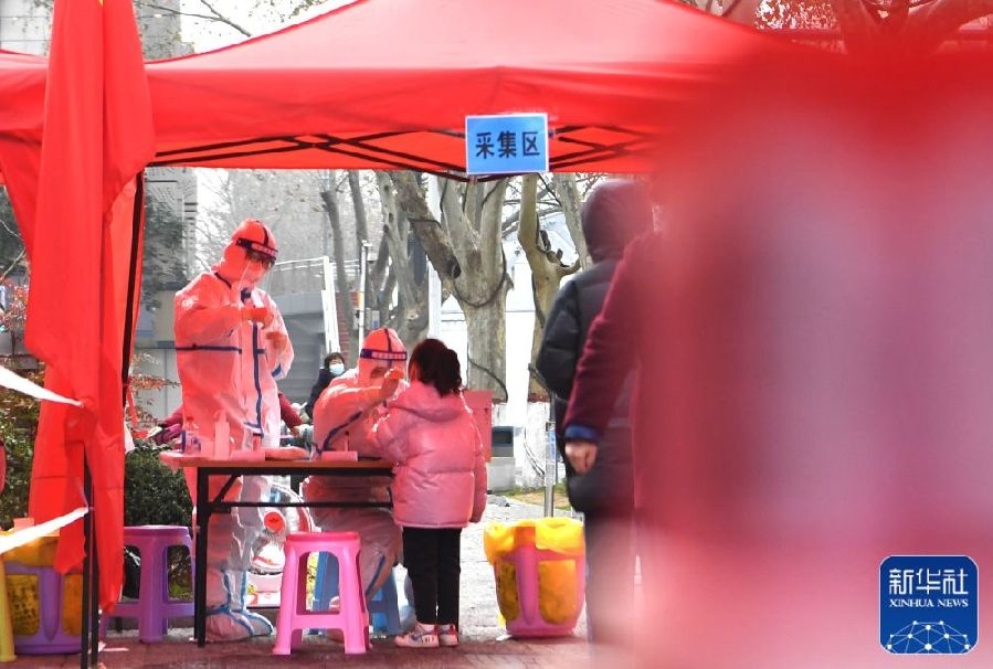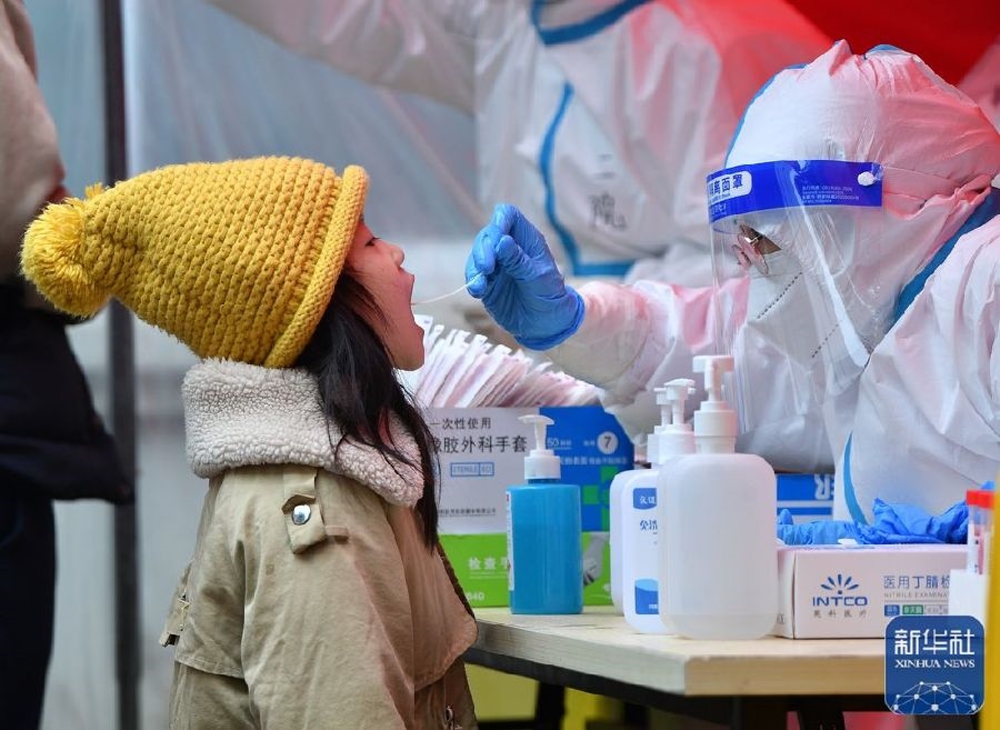 1月8日,在鄭州市金水區(qū)花園路街道辦事處一社區(qū)核酸檢測(cè)點(diǎn),醫(yī)務(wù)人員為小朋友進(jìn)行核酸檢測(cè)取樣。新華社記者郝源攝