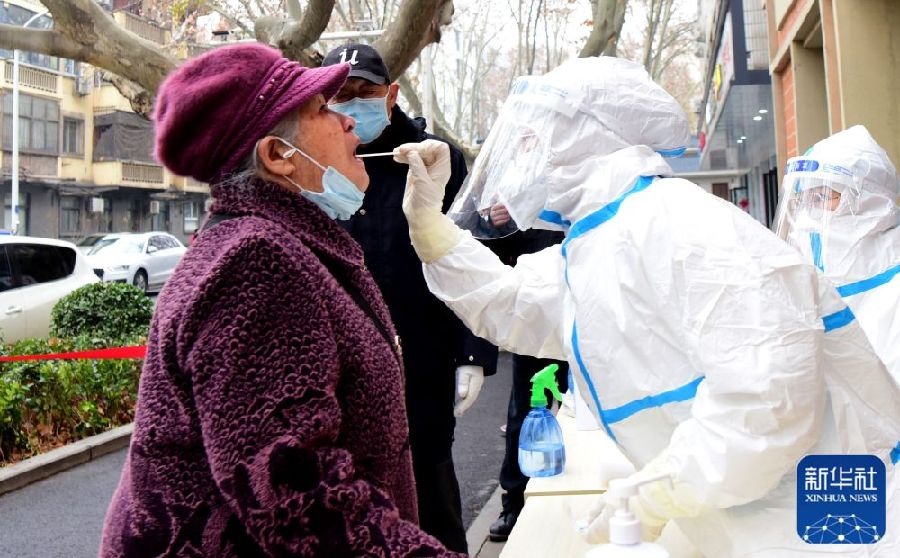 1月8日,在鄭州市高新區(qū)楓楊辦事處譽(yù)園核酸檢測(cè)點(diǎn),醫(yī)務(wù)人員為市民進(jìn)行核酸檢測(cè)取樣。新華社記者張浩然攝