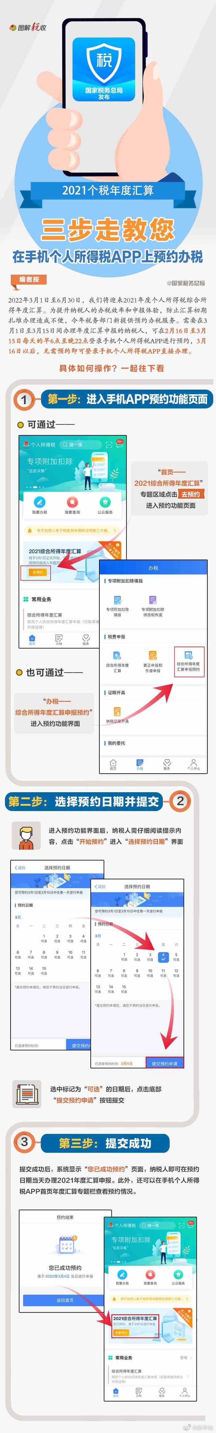 2022年3月1日至6月30日,我們將迎來2021年度個人所得稅綜合所得年度匯算。為提升納稅人的辦稅效率和申報體驗,今年稅務部門新提供預約辦稅服務。如何通過個人所得稅APP進行預約辦稅?很簡單,三步走,手把手教你輕松搞定,看圖了解↓(記者 王雨蕭;圖片來源:國家稅務總局)