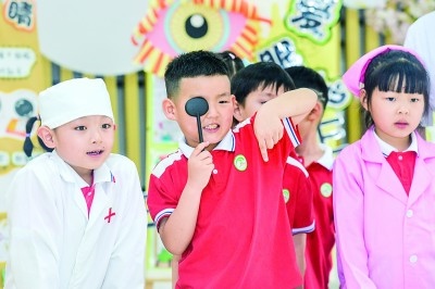 浙江湖州市長興縣開發(fā)區(qū)中心幼兒園內,孩子們在進行視力檢測。吳拯攝/光明圖片