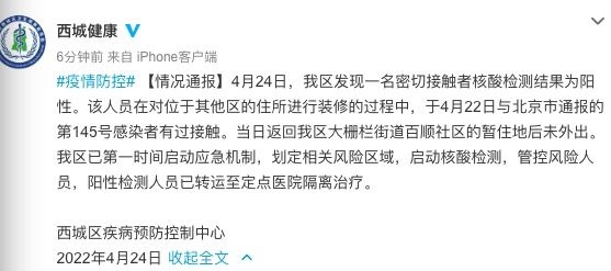4月24日,我區(qū)(北京市西城區(qū))發(fā)現(xiàn)一名密切接觸者核酸檢測結(jié)果為陽性。該人員在對位于其他區(qū)的住所進(jìn)行裝修的過程中,于4月22日與北京市通報(bào)的第145號感染者有過接觸。當(dāng)日返回我區(qū)大柵欄街道百順社區(qū)的暫住地后未外出。