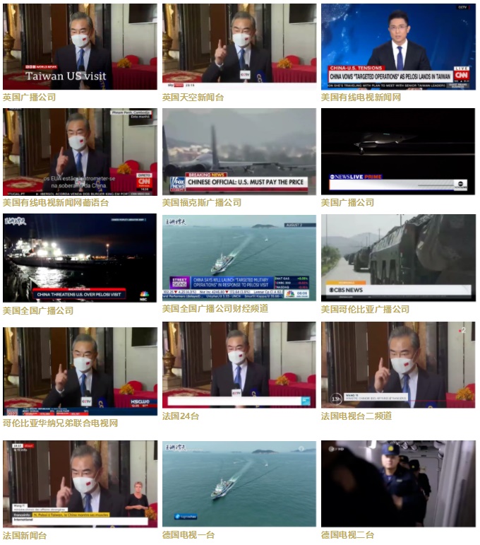 總臺國際視頻通訊社聚焦外交部、國臺辦、東部戰(zhàn)區(qū)等權(quán)威表態(tài),可視化制作編發(fā)《國際銳評》《玉淵譚天》等相關(guān)評論言論。截至8月4日10時,共有84條新聞素材得到BBC、CNN、CNBC、英國天空新聞臺、法國24臺、法國電視臺、法國新聞臺、德國電視一臺、德國電視二臺、德國之聲、意大利廣播電視公司、意大利TGCOM24電視臺、加拿大廣播公司、加拿大最大的商業(yè)電視網(wǎng)CTV、俄羅斯第一頻道、全俄國家電視廣播公司、日本NHK、韓國KBS、巴西環(huán)球電視臺、印度國家電視臺、新加坡亞洲新聞臺、澳大利亞廣播公司、卡塔爾半島電視臺、墨西哥阿茲特克電視臺、印尼國家廣播電視臺等102個國家和地區(qū)的1683個電視臺及新媒體平臺采用。國際視頻通訊社還特別面向中國臺灣地區(qū)的媒體進行精準(zhǔn)投送,實現(xiàn)臺灣地區(qū)主流電視臺全覆蓋,落地效果突出:臺灣東森電視臺、臺灣無線衛(wèi)星電視臺(TVBS)、臺灣中華電視臺、臺灣中天電視臺等共有13個臺灣電視臺及采用播出744次,播出總時長3小時26分44秒。