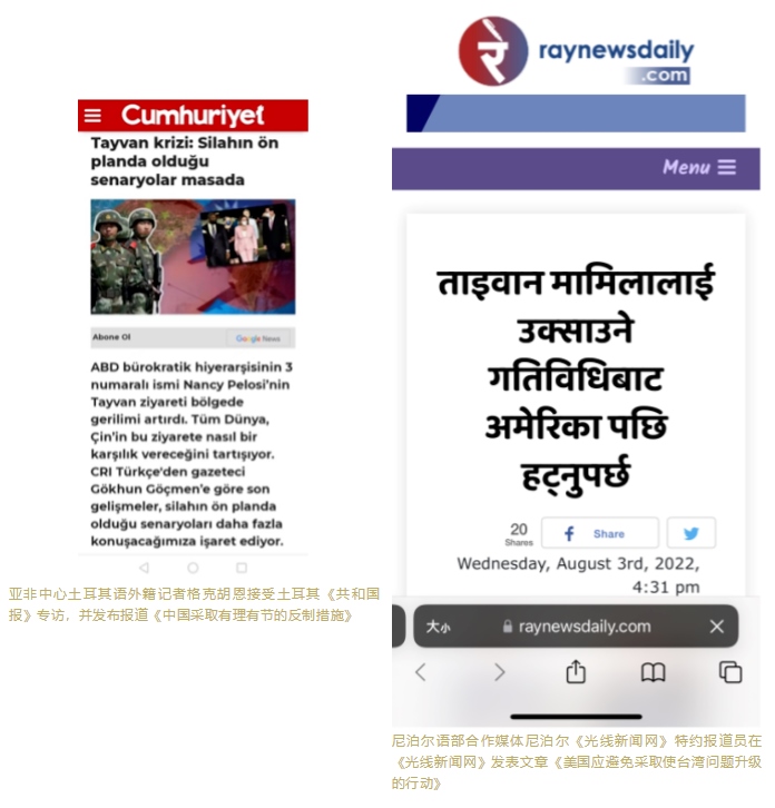 亞非中心土耳其、希伯來語、豪薩語、尼泊爾語、蒙古語等多語種主播、評論員和網(wǎng)紅積極在多家外媒發(fā)聲,接受了包括以色列電視臺、土耳其AHABER新聞臺、土耳其TGRT電視臺、土耳其新聞電視臺等多家國際媒體的采訪連線,同時多名外籍記者、海外特約評論員在尼日利亞《領(lǐng)導(dǎo)者報》網(wǎng)站、尼泊爾《光線新聞網(wǎng)》、肯尼亞《人民報》、蒙古國媒體SONIN.MN等對象國主流媒體發(fā)表評論及署名文章,對外闡釋中方立場和反制措施的合理性、正當(dāng)性,介紹臺灣問題歷史經(jīng)緯,揭批美國在臺灣問題上的背信棄義。