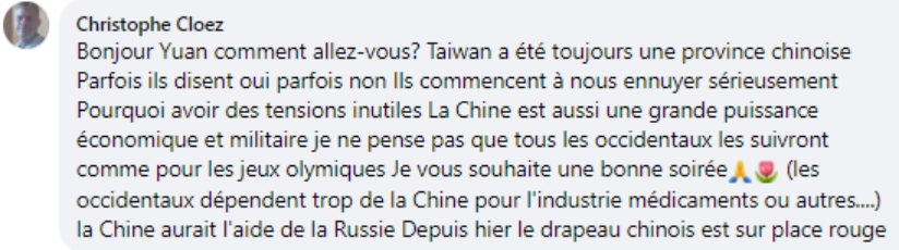 法語網(wǎng)友克羅茲:“臺灣始終是中國的一個省,美國人一會兒承認一會兒又不承認,現(xiàn)在他們又開始搗亂。為什么要制造這種毫無意義的緊張氣氛呢?中國是一個經(jīng)濟和軍事大國,我不認為西方會跟著美國走,就像之前的奧運會一樣,西方國家太依賴于中國工業(yè)了。俄羅斯應(yīng)該是支持中國的吧,昨天紅場上方都飄著中國國旗。”
