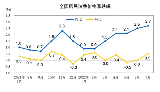 2022年7月份,全國居民消費價格同比上漲2.7%。其中,城市上漲2.6%,農村上漲3.0%;食品價格上漲6.3%,非食品價格上漲1.9%;消費品價格上漲4.0%,服務價格上漲0.7%。1--—7月平均,全國居民消費價格比上年同期上漲1.8%。