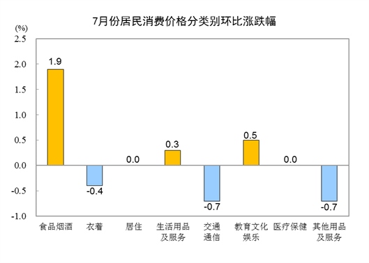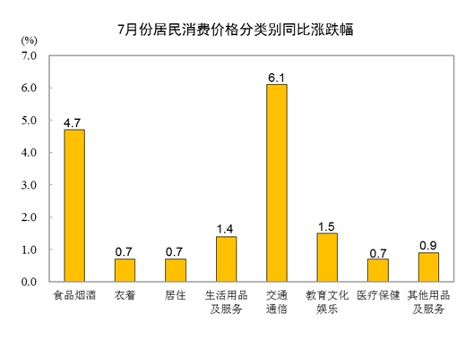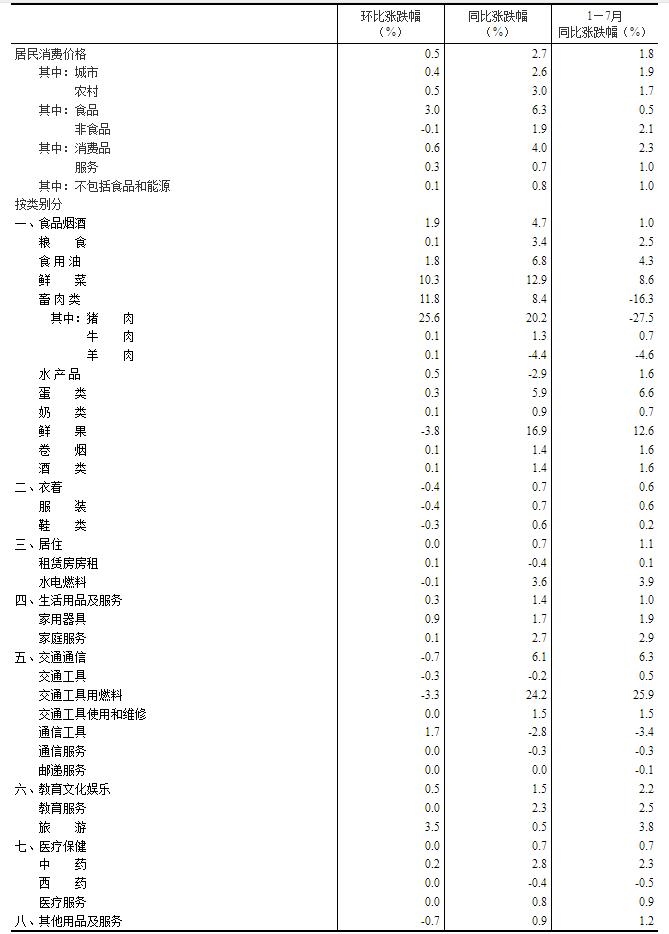 7月份,全國居民消費價格環(huán)比上漲0.5%。其中,城市上漲0.4%,農村上漲0.5%;食品價格上漲3.0%,非食品價格下降0.1%;消費品價格上漲0.6%,服務價格上漲0.3%。