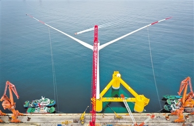 由中國船舶集團海裝風(fēng)電股份有限公司牽頭,聯(lián)合相關(guān)單位自主研制的“扶搖號”浮式風(fēng)電機組浮體平臺上配備6.2兆瓦抗臺型I類風(fēng)力發(fā)電機組,在深遠海應(yīng)用場將依靠九個對稱分布的懸錨鏈系泊實現(xiàn)固定。圖為完成總裝的國內(nèi)首臺深遠海浮式風(fēng)電裝備“扶搖號”在茂名廣港碼頭靜待拖航(無人機照片)。記者劉大偉攝