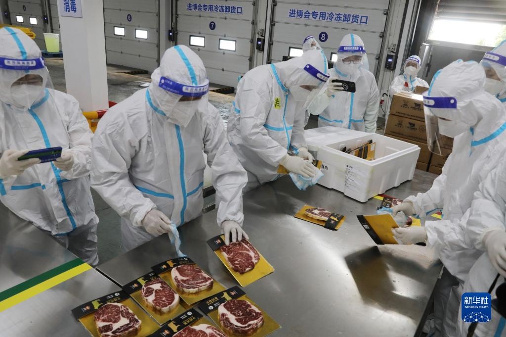 記者在現(xiàn)場(chǎng)看到,當(dāng)運(yùn)輸進(jìn)口冷鏈?zhǔn)称氛蛊返能囕v到達(dá)后,工作人員馬上對(duì)司機(jī)進(jìn)行健康碼核驗(yàn)和體溫檢測(cè),并對(duì)車輛進(jìn)行消毒。裝卸過(guò)程中,司機(jī)實(shí)行“非必要不下車”。貨物入庫(kù)時(shí),在完成外包裝消毒后,工作人員將展品拆除外包裝,對(duì)內(nèi)里的小包裝進(jìn)行消毒、核酸檢測(cè),再重新裝箱、貼標(biāo)簽、放入暫存庫(kù),之后再轉(zhuǎn)入合格儲(chǔ)存庫(kù)。