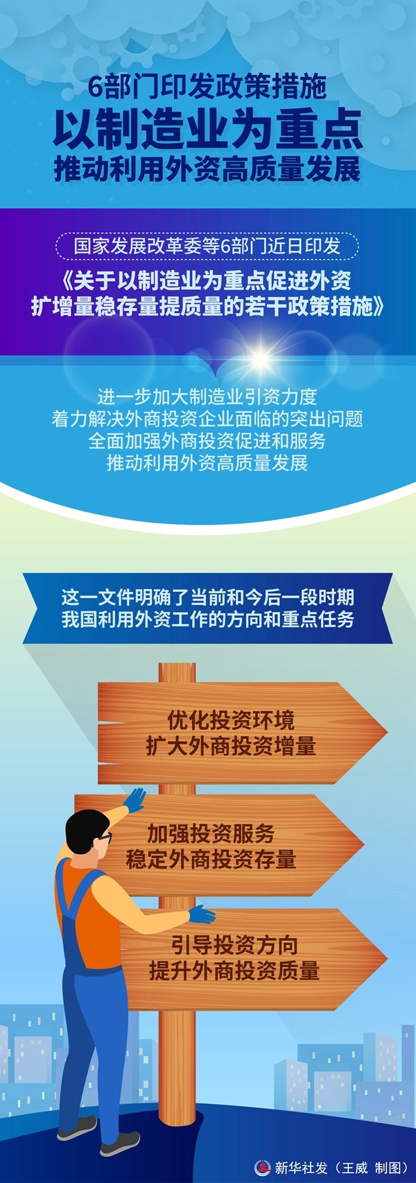 新華社北京10月25日電(記者安蓓)記者25日了解到,國家發(fā)展改革委等6部門近日印發(fā)《關(guān)于以制造業(yè)為重點(diǎn)促進(jìn)外資擴(kuò)增量穩(wěn)存量提質(zhì)量的若干政策措施》,進(jìn)一步加大制造業(yè)引資力度,著力解決外商投資企業(yè)面臨的突出問題,全面加強(qiáng)外商投資促進(jìn)和服務(wù),推動利用外資高質(zhì)量發(fā)展。