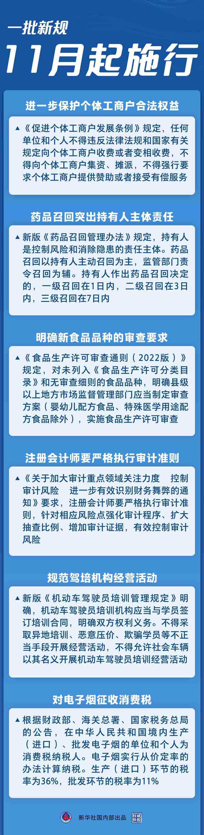 這個(gè)11月,一批民生新規(guī)開始施行,影響社會(huì)生活諸多方面。保護(hù)個(gè)體工商戶合法權(quán)益、規(guī)范駕培機(jī)構(gòu)經(jīng)營(yíng)活動(dòng)、完善藥品召回分級(jí)制度……更完善的法治,讓你我更有獲得感。