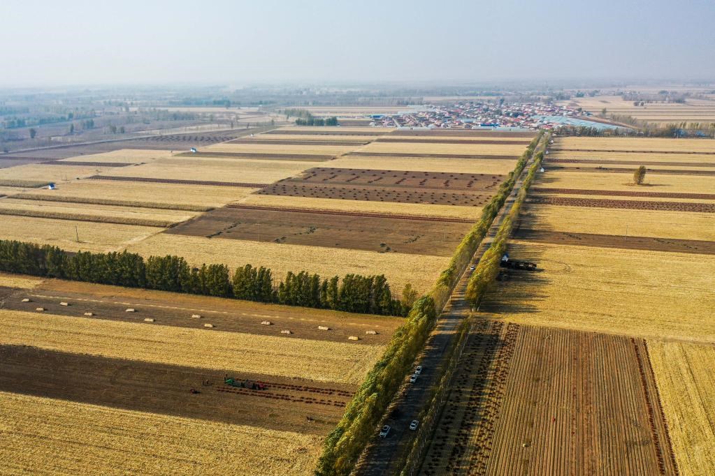 10月25日,在內(nèi)蒙古自治區(qū)通遼市開魯縣東風鎮(zhèn),一些地塊上的玉米和紅干椒已經(jīng)收割結(jié)束。(無人機照片)新華社記者連振 攝