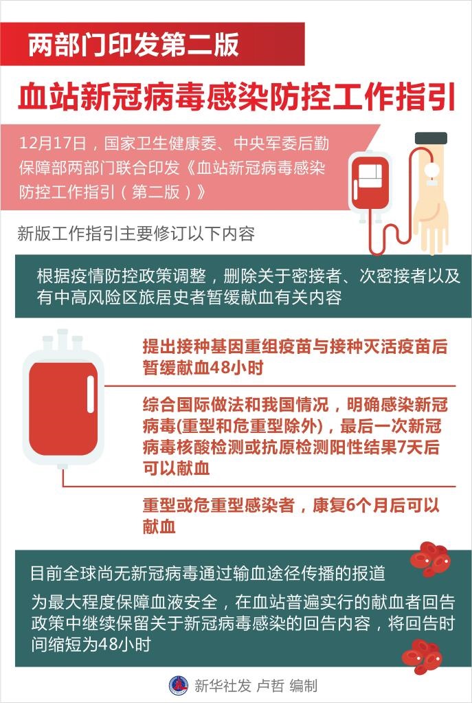 新華社北京12月17日電(記者顧天成、董瑞豐)血站新冠病毒感染防控工作事關血液安全平穩(wěn)供應。17日,國家衛(wèi)生健康委、中央軍委后勤保障部兩部門聯(lián)合印發(fā)《血站新冠病毒感染防控工作指引(第二版)》,指導采供血機構切實做好新形勢下疫情防控工作,保障血站工作人員和獻血者安全,實現血液安全供應。