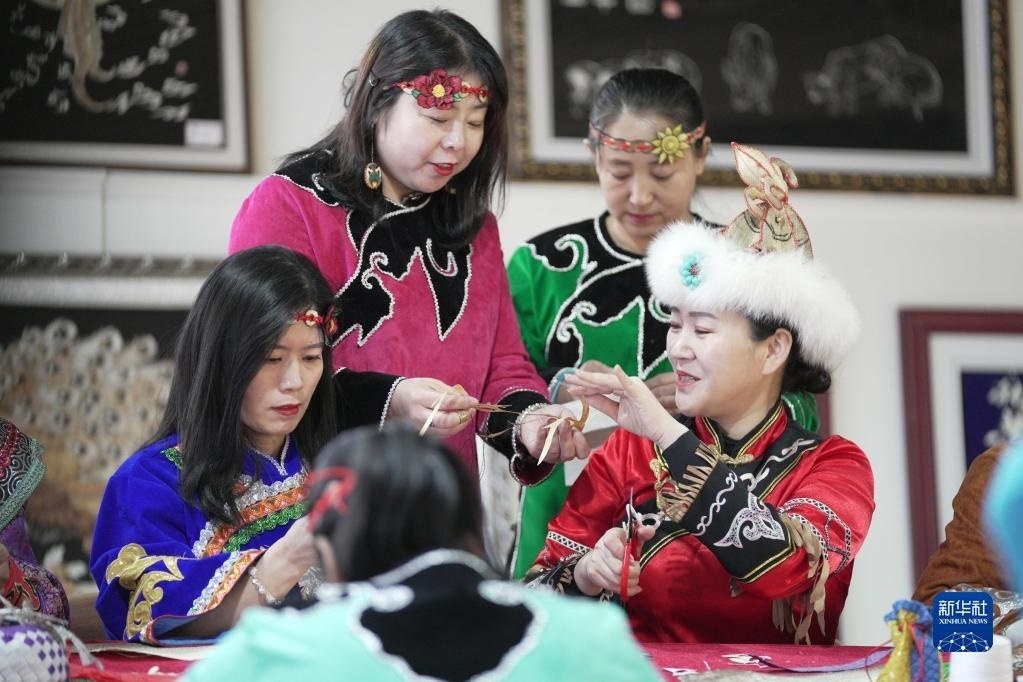2月22日,在黑龍江省同江市非物質(zhì)文化遺產(chǎn)展示館,劉蕾(右一)在學習魚皮制作技藝。新華社記者 王建威 攝