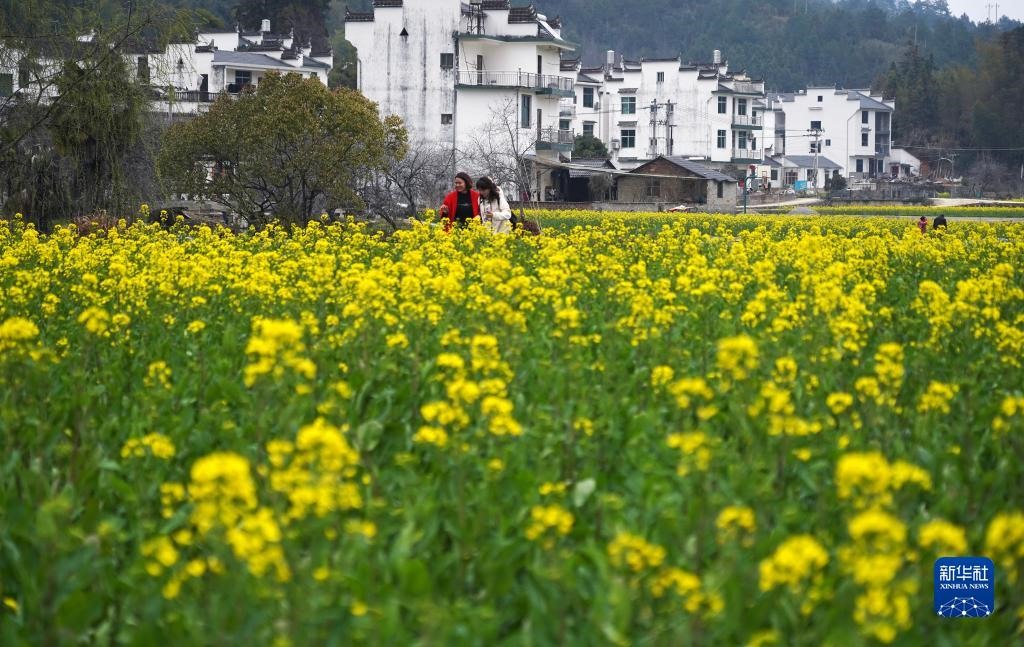 近日,隨著氣溫回暖,江西婺源迎來賞花季,花海層疊掩映在白墻黛瓦間,吸引游客前來踏青賞花,享受美好春光。