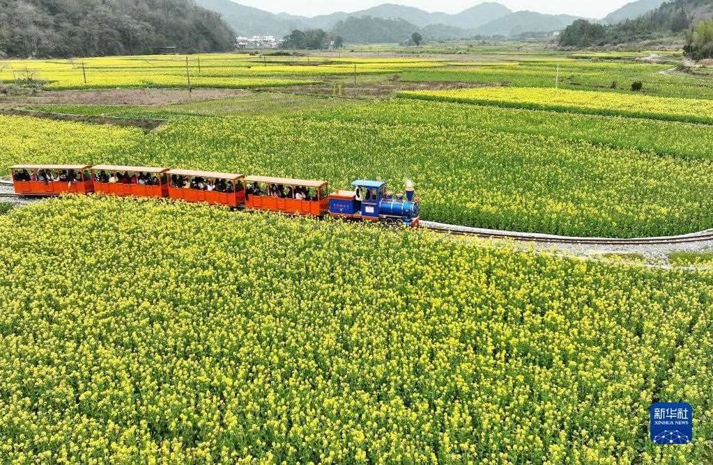 游客在江西省婺源縣嚴(yán)田景區(qū)乘坐“小火車”觀賞花海(3月3日攝,無人機(jī)照片)。