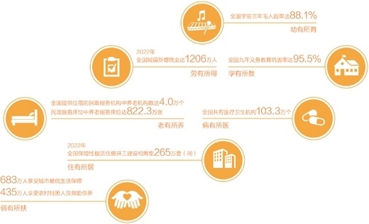實實在在的舉措,帶來了實實在在的成效。城鄉(xiāng)學(xué)前教育公共服務(wù)體系基本建成,學(xué)前三年毛入園率由2011年的62.3%提高到2021年的88.1%。堅持政府舉辦義務(wù)教育,九年義務(wù)教育鞏固率達95.5%,初中在校生5120.6萬人,普通小學(xué)在校生10732.0萬人;實施就業(yè)優(yōu)先戰(zhàn)略,確保就業(yè)局勢總體穩(wěn)定,2022年城鎮(zhèn)新增就業(yè)達1206萬人,脫貧人口務(wù)工規(guī)模3278萬人,100個城市公共就業(yè)服務(wù)機構(gòu)求人倍率為1.46,繼續(xù)保持在1以上,崗位供給大于求職人數(shù);著力解決群眾看病難、看病貴問題,人民健康水平穩(wěn)步提升,全國共有醫(yī)療衛(wèi)生機構(gòu)103.3萬個,醫(yī)療衛(wèi)生機構(gòu)床位975萬張,參加基本醫(yī)療保險人數(shù)達到134570萬人;不斷推進養(yǎng)老事業(yè)和養(yǎng)老產(chǎn)業(yè)協(xié)同發(fā)展,養(yǎng)老服務(wù)體系更加健全,全國提供住宿的民政服務(wù)機構(gòu)中養(yǎng)老機構(gòu)達4.0萬個,民政服務(wù)床位中養(yǎng)老服務(wù)床位達822.3萬張;加快推進住房保障和供應(yīng)體系建設(shè),2022年全年全國各類棚戶區(qū)改造開工134萬套,基本建成181萬套,全國保障性租賃住房開工建設(shè)和籌集265萬套(間),群眾居住條件不斷改善;扎實做好因疫因災(zāi)遇困群眾和老弱病殘等特殊群體的基本生活保障,2022年年末,683萬人享受城市最低生活保障,435萬人享受農(nóng)村特困人員救助供養(yǎng),全年臨時救助1083萬人次,保障網(wǎng)越織越密實。