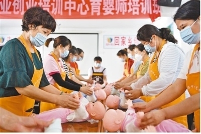 湖北省襄陽市??悼h就業(yè)創(chuàng)業(yè)培訓(xùn)中心,學(xué)員在育嬰師培訓(xùn)班上練習(xí)新生兒護理技能。楊 韜攝(影像中國)
