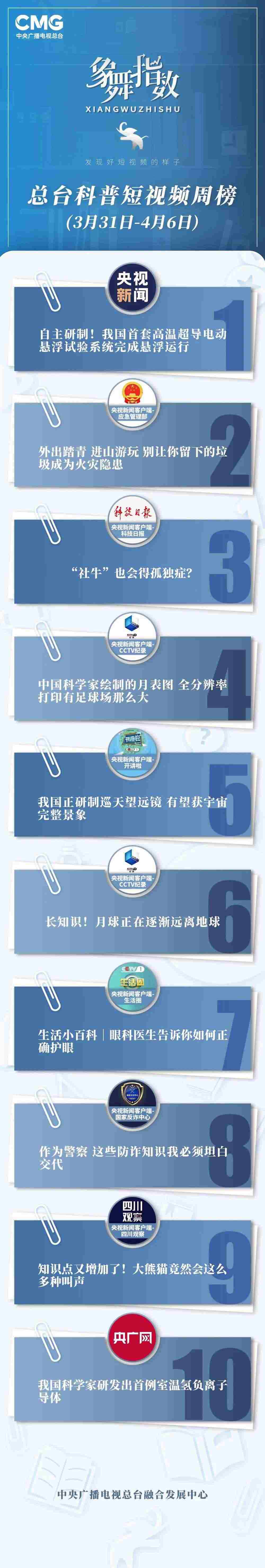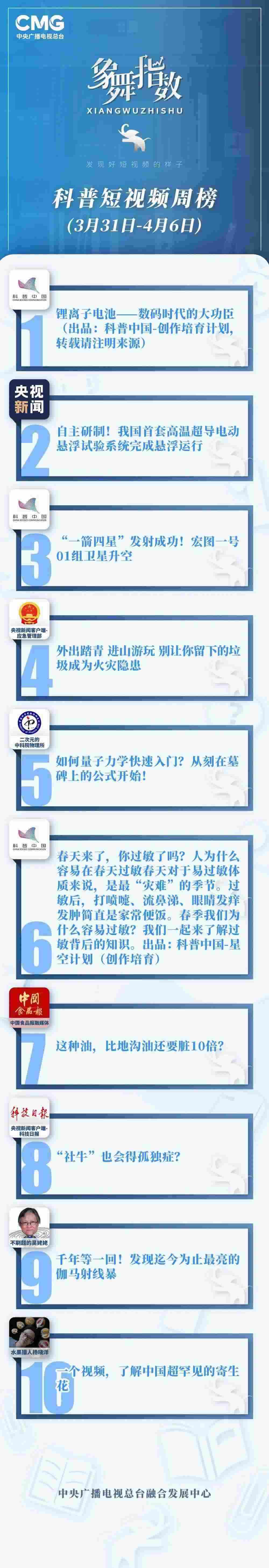 中央廣播電視總臺“象舞指數(shù)”評議品牌,推出科普短視頻周榜、總臺科普短視頻周榜。在2023年3月31日-4月6日,值得注目的內容有:
