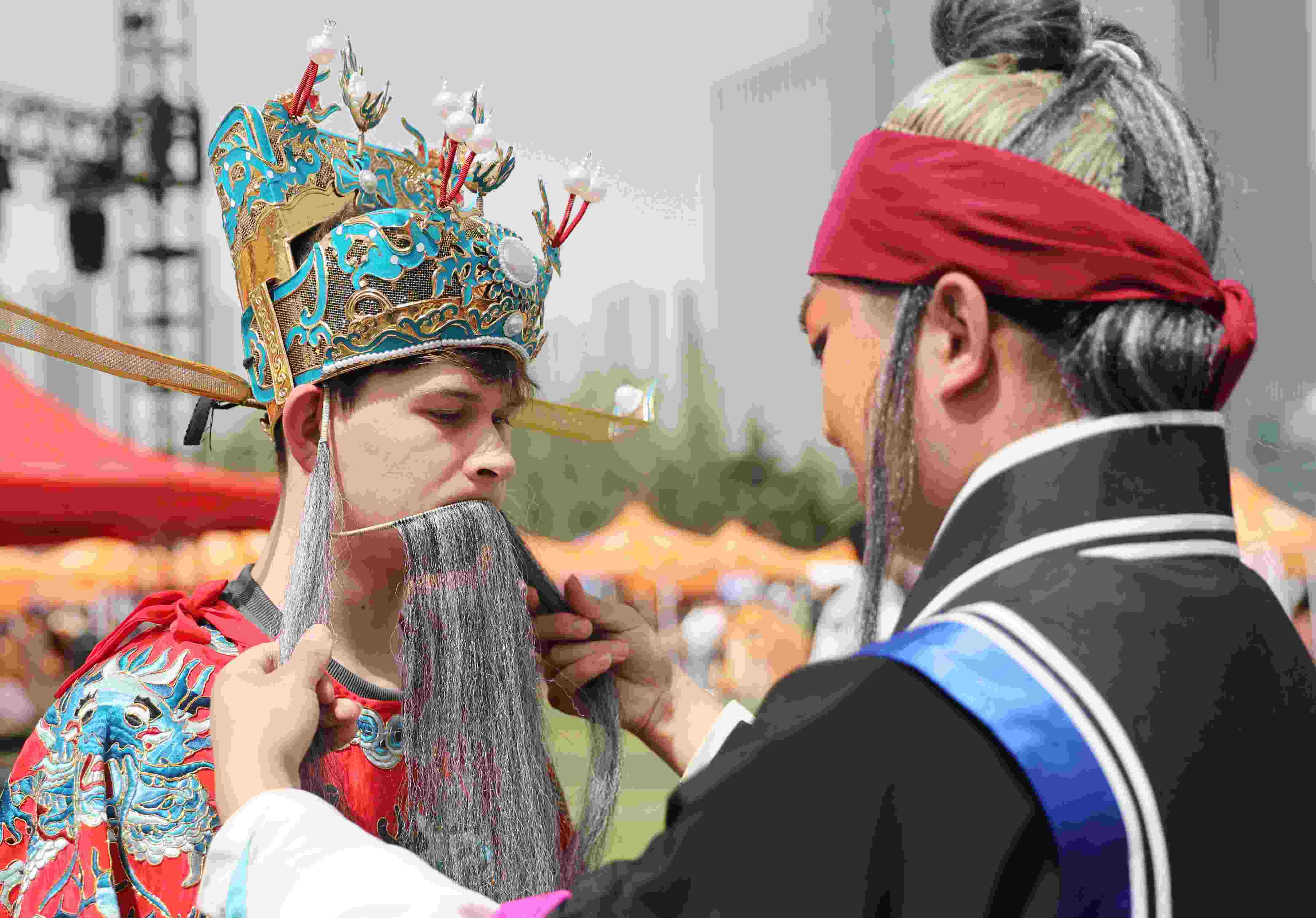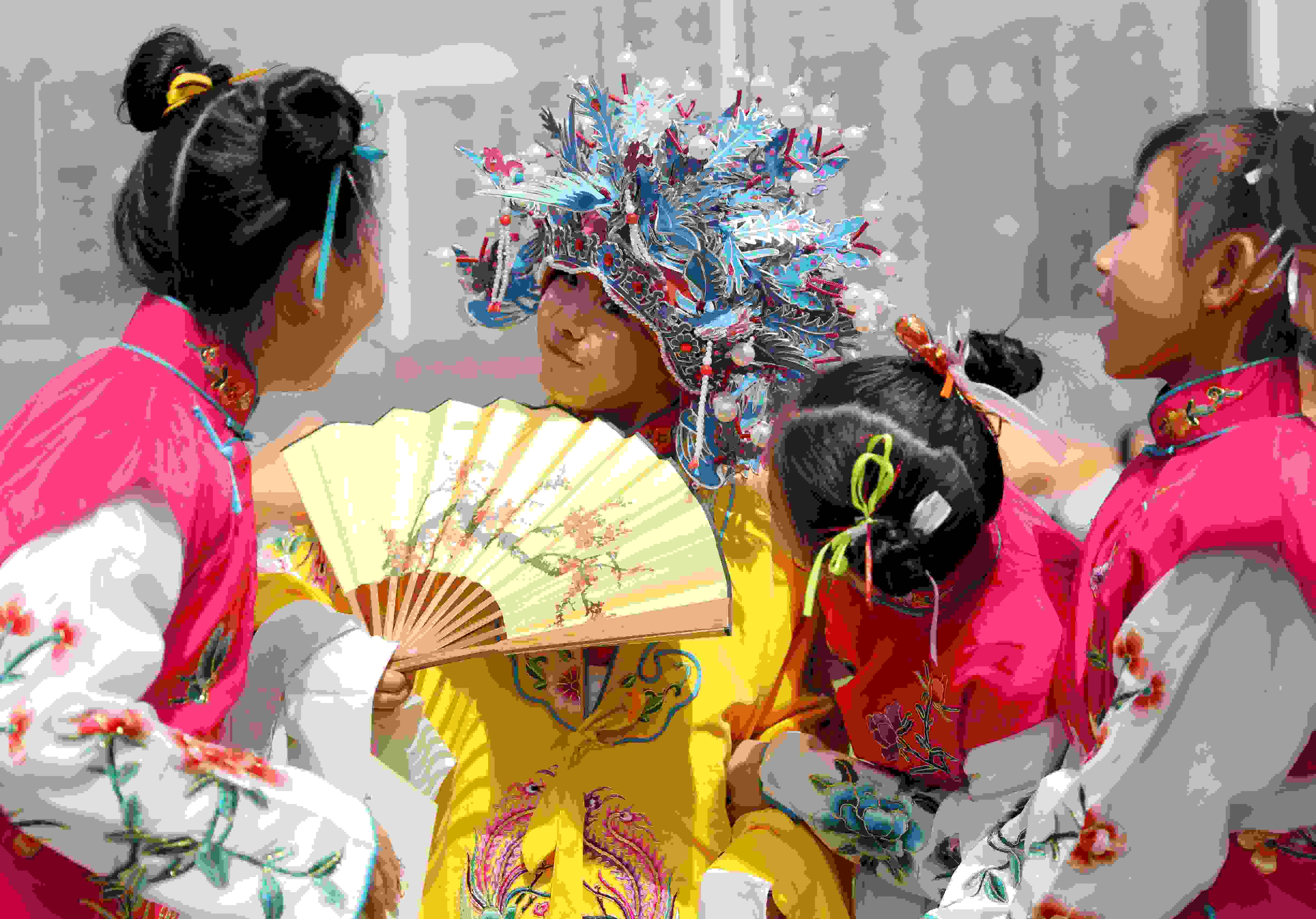 4月15日,山東青島,中國石油大學(xué)(華東)韻遠(yuǎn)京劇隊(duì)的同學(xué)們聯(lián)合青島西海岸新區(qū)珠江路小學(xué)的小學(xué)生們在大學(xué)校園里上演了一堂生動(dòng)的戲曲普及課。