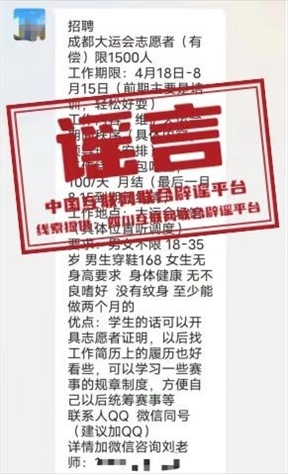 謠言:成都大運(yùn)會(huì)志愿者招募中,將按月發(fā)放補(bǔ)貼?