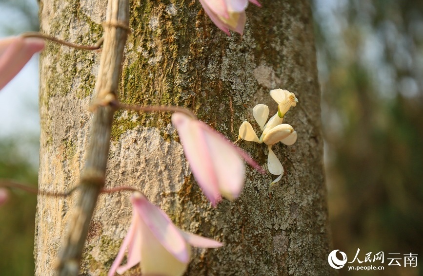 周會蘭介紹,4月12日早上,她吃過早飯后來到自家附近的山上采摘可食用的白花,在一條箐溝旁的樹林陡坡處,她采摘了一些白花后,轉(zhuǎn)身開始撿拾落在草叢中的白花?!巴蝗?,一朵白色的花引起了我的注意,當(dāng)我伸手去撿時,這朵花竟然自己挪了個位置?!敝軙m說,當(dāng)時覺得很奇怪,花還會自己動,慢慢才發(fā)現(xiàn)是一只蟲子。