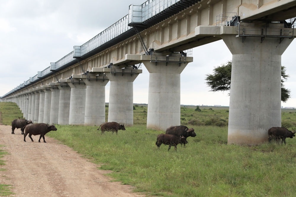 水牛在裝有聲屏障的肯尼亞內(nèi)羅畢國家公園特大橋下穿行(2021年5月19日攝)。中非共建的肯尼亞內(nèi)馬鐵路采用特大橋全程穿越內(nèi)羅畢國家公園方案,橋墩超過6米,讓長頸鹿也能“昂首通過”;特大橋護(hù)欄兩側(cè)安裝聲屏障,極大降低火車通過時(shí)的噪音。