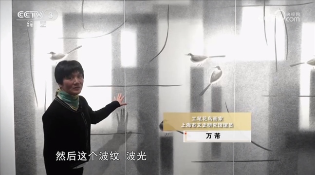 工筆花鳥畫家 上海市文史研究館館員 萬芾:我們看到水泥柱子嘛,方的,這個(gè)波紋我是用山水畫里的披麻皴的皴法,形成水光瀲滟的效果,畫面也是用了一個(gè)比較抽象的點(diǎn)線面的元素來處理的,追求還是中國傳統(tǒng)繪畫里的氣韻生動(dòng),只是整個(gè)畫面第一感覺的形式讓人現(xiàn)代的感覺。