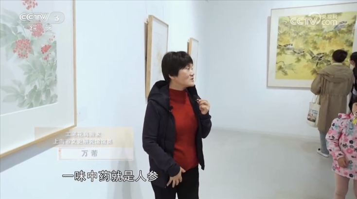 工筆花鳥畫家 上海市文史研究館館員 萬芾:我們看看這幅,這幅應(yīng)該我們很熟悉的一味中藥材就是人參,看了中藥這么美麗的花,這么有生命力的現(xiàn)象,是不是我們吃的時(shí)候也不苦了。